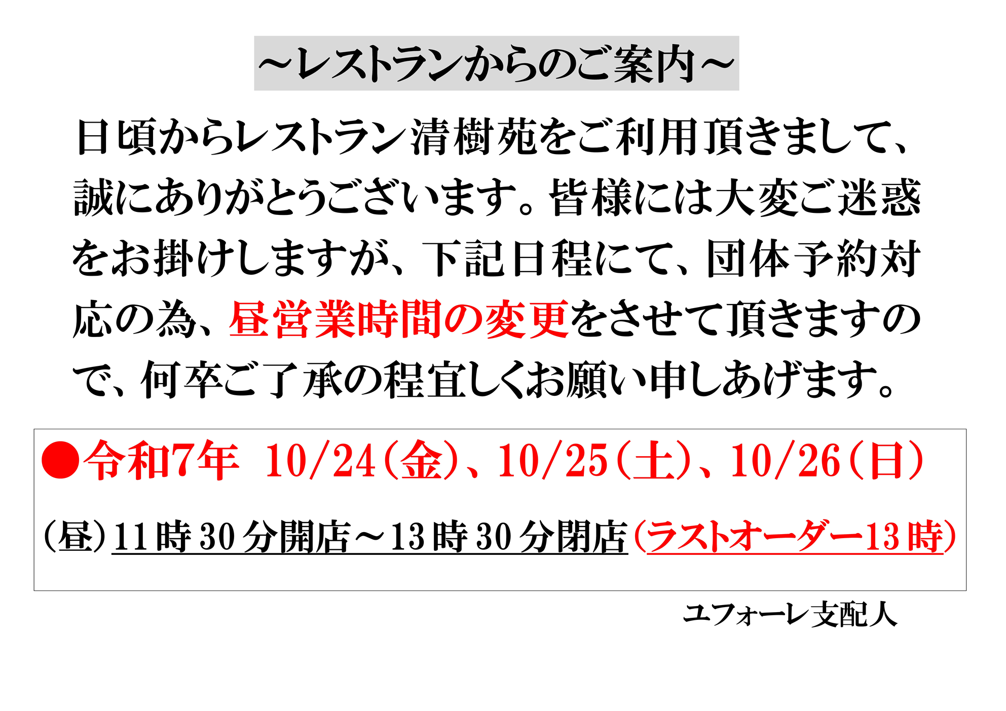 レストラン営業時間変更のお知らせ(10/24~10/26)