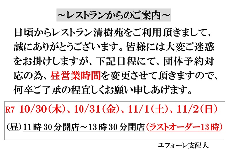 レストラン営業時間変更のお知らせ(10/30~11/2)