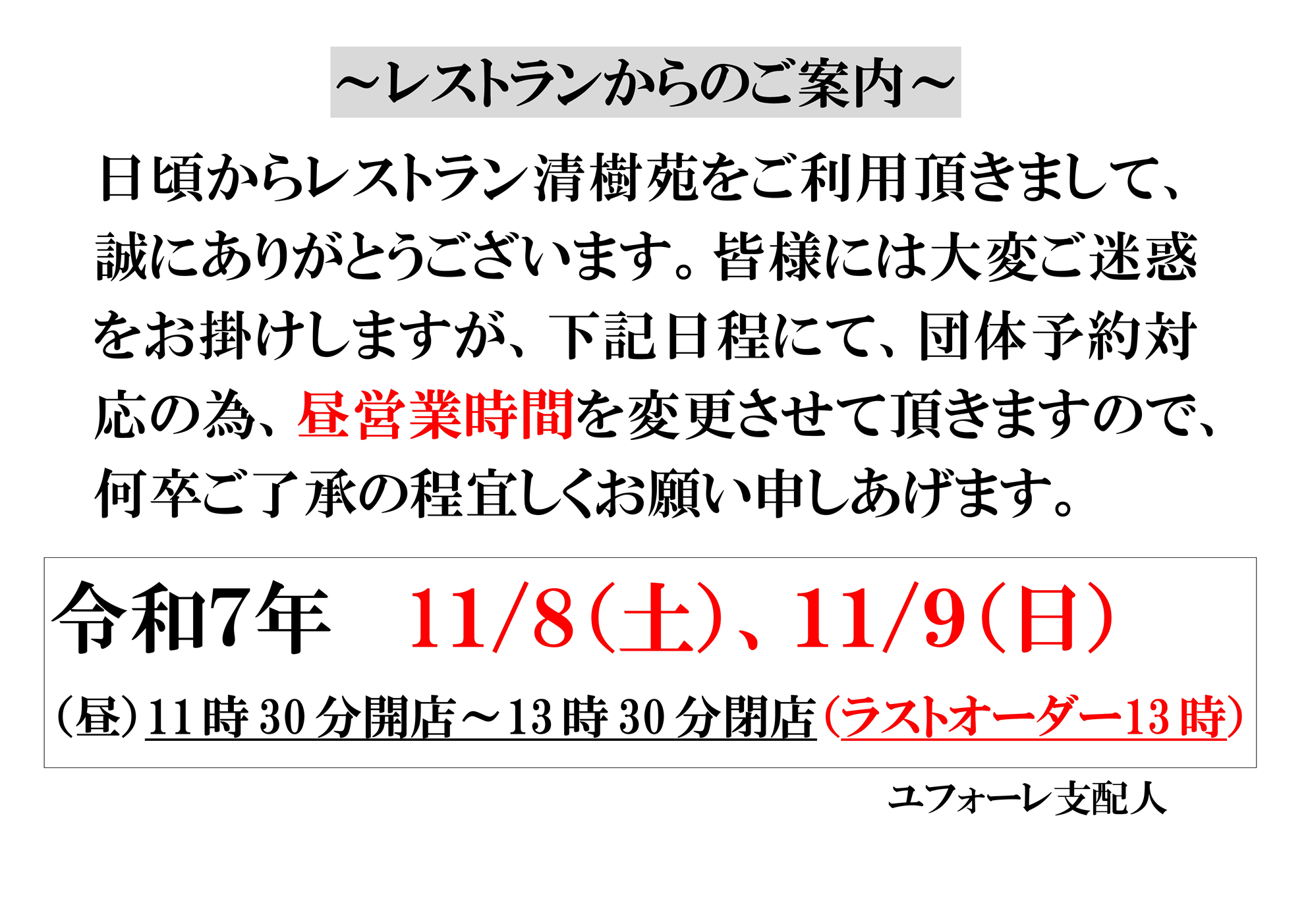 レストラン昼営業時間変更のお知らせ(11/8、11/9)
