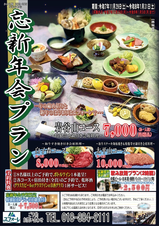 忘新年会プランのお知らせ!忘新年会もユフォーレで🍶